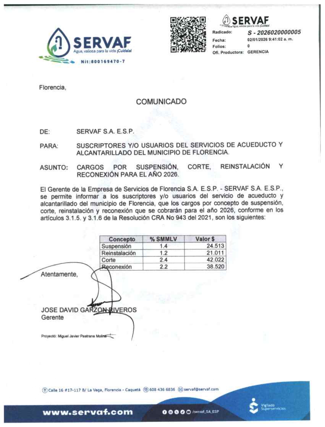 Cargos por suspensión, corte, reinstalación y reconexión año 2026