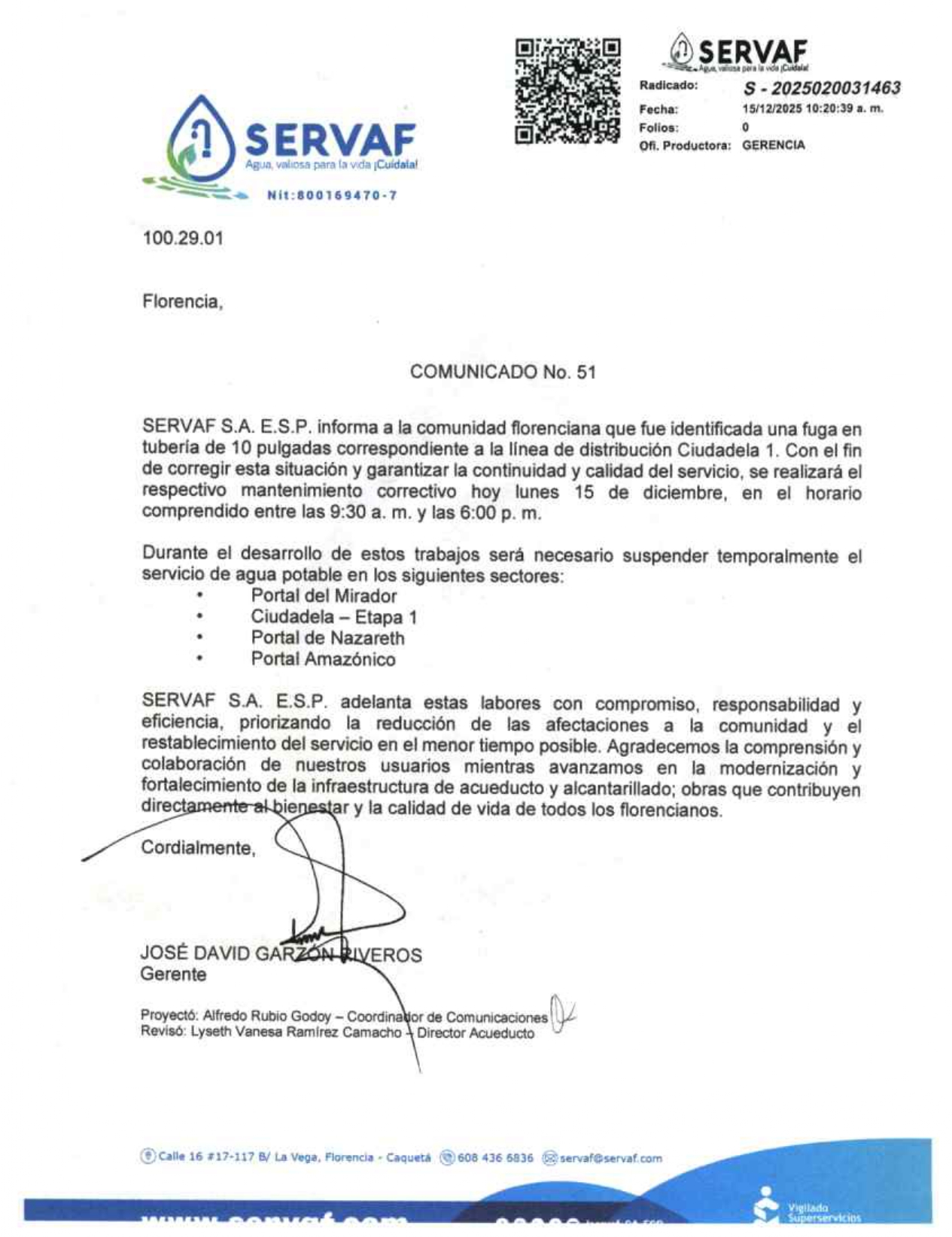 SUSPENSIÓN DEL SERVICIO DE ACUEDUCTO FLORENCIA – CAQUETÁ